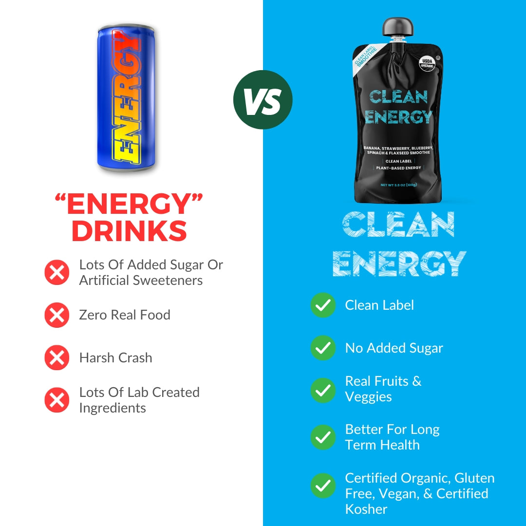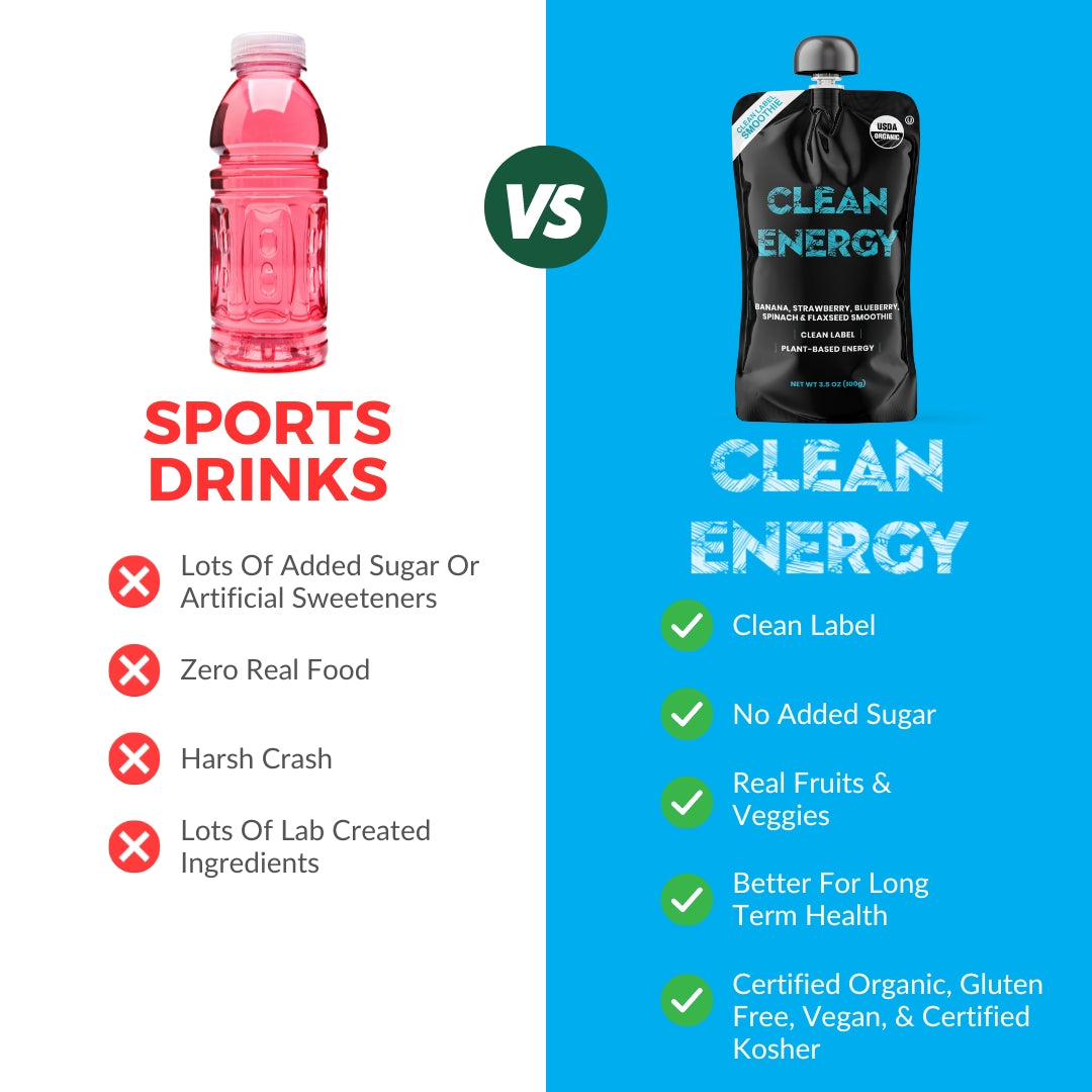 Clean Energy is the only clean label sports and energy drink, changing the paradigm for healthy fueling when active. Big brand sports and energy drinks are the prototypes of ultra-processed food. Clean Energy contains only organic fruits and vegetables. The result is more bioavailable energy in the short term and more healthful energy in the long term. Clean Energy is shelf stable for months, durable, and portable, for wherever and whenever you go. Clean Energy is healthy energy for the long run of life.